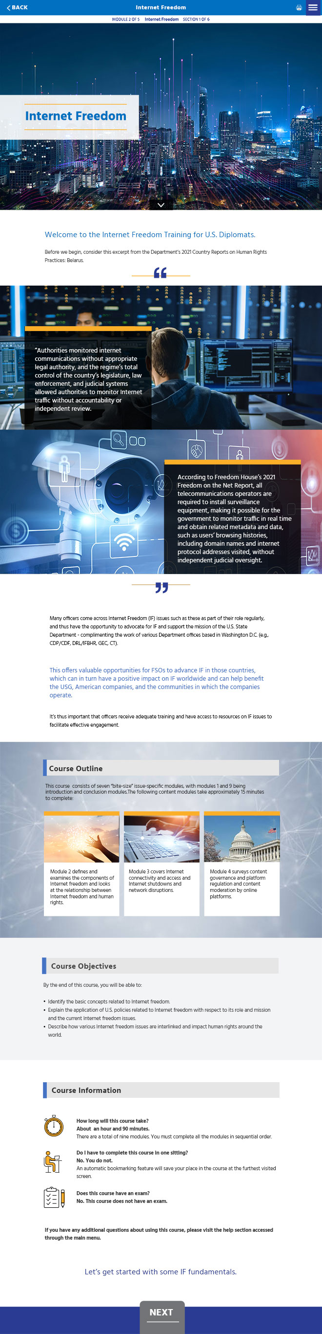 Lead designer on a variety of eLearning courses that include custom illustrations, animations, and responsive web design that adhere to 508 accessibility standards at the Foreign Service Institute.